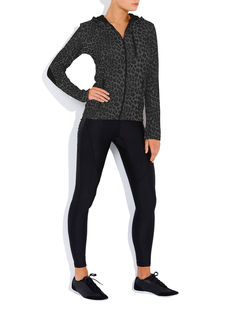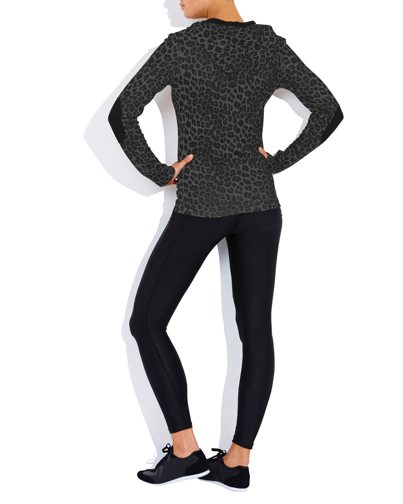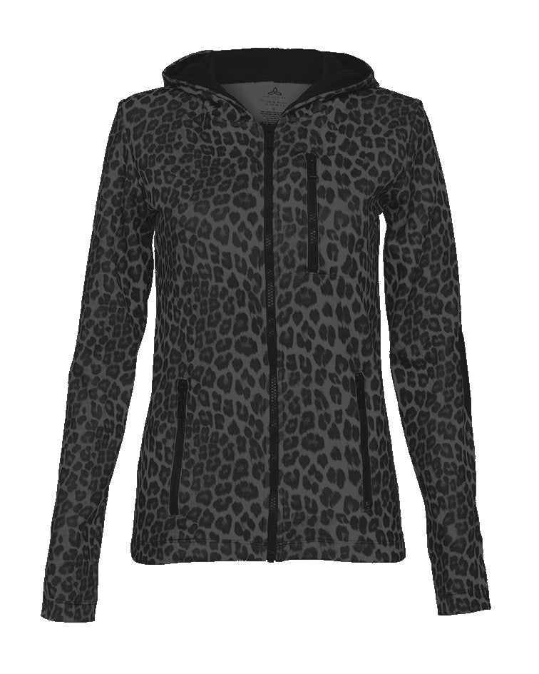 The ultimate in chic, the Phoebe Black Leopard hoodie offers an stealth take on the classic leopard print. With statement pockets and scuba zips, contrast paneling on the elbows (with a super cute mini polka dot) and a full zip front to keep you cool from the beach to the gym. Made from our unique Merino Perform Advantage fabric with anti-microbial and moisture wicking performance, this black leopard print hoodie will keep you comfortable all day long.